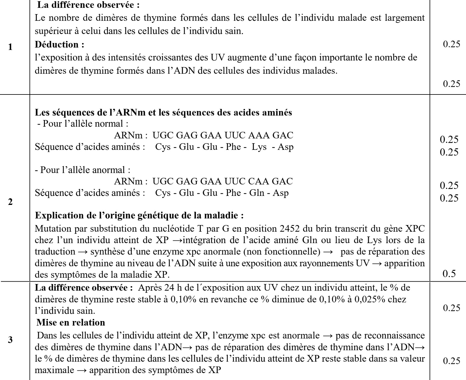 Donnée 3 : Les cellules de l'organisme contiennent des enzymes qui assurent la réparation de I'ADN en cas d'altération. Le gène XPC code pour une enzyme xpc qui intervient dans le processus de réparation des dimères de thymine. Cette enzyme est non fonctionnelle chez les personnes atteintes de XP. Le gène XPC existe sous deux formes alléliques. La figure (a) du document 2 présente deux fragments d'ADN du brin transcrit de l'allèle normal d'un individu sain et de l'allèle anormal d'un individu malade. La figure (b) du même document présente un extrait du tableau du code génétique