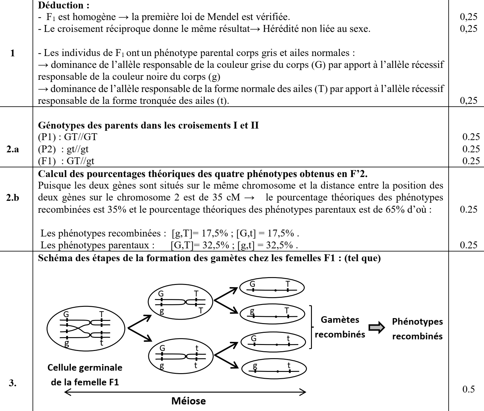 3. Réaliser un schéma des étapes de la formation des gamètes des femelles F1, expliquant l'apparition des phénotypes recombinés à la génération F'2 en précisant l'emplacement des allèles étudiés. (0.5 pt)