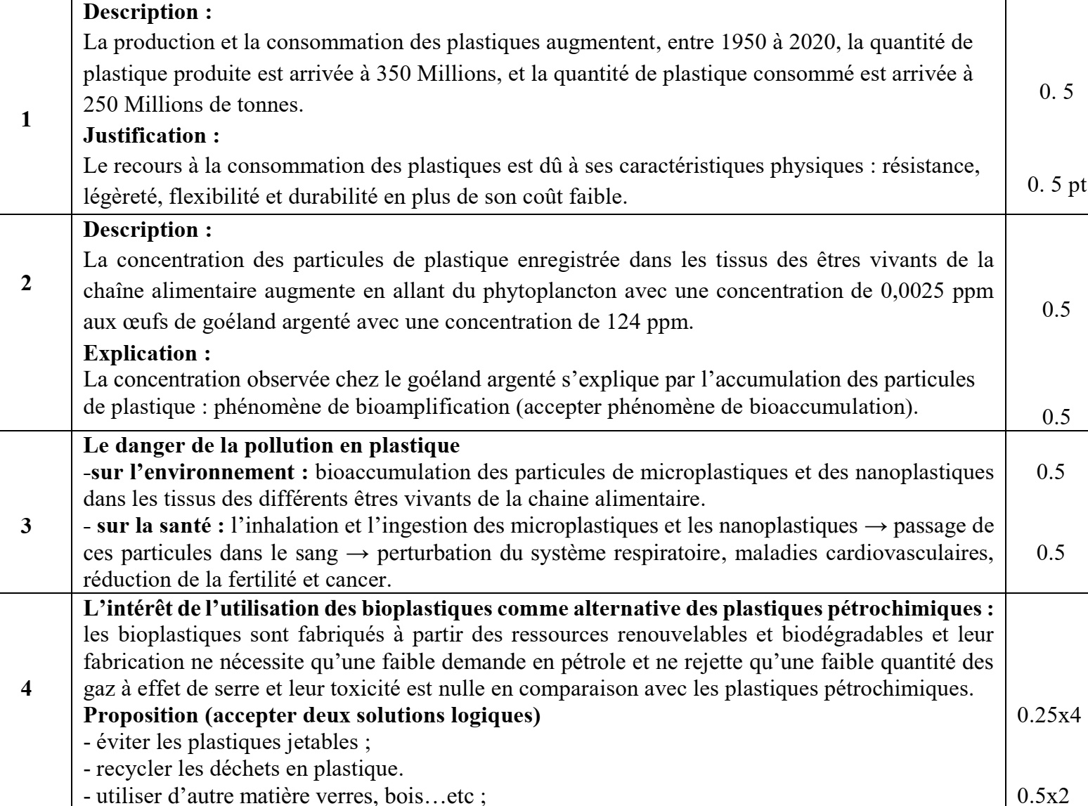 4. En vous basant sur le document (5) et vos connaissances, montrer l'intérêt de l'utilisation des bioplastiques comme alternative des plastiques pétrochimiques. Puis proposer deux autres solutions adéquates pour faire face au problème de la pollution par le plastique. (2 pt)