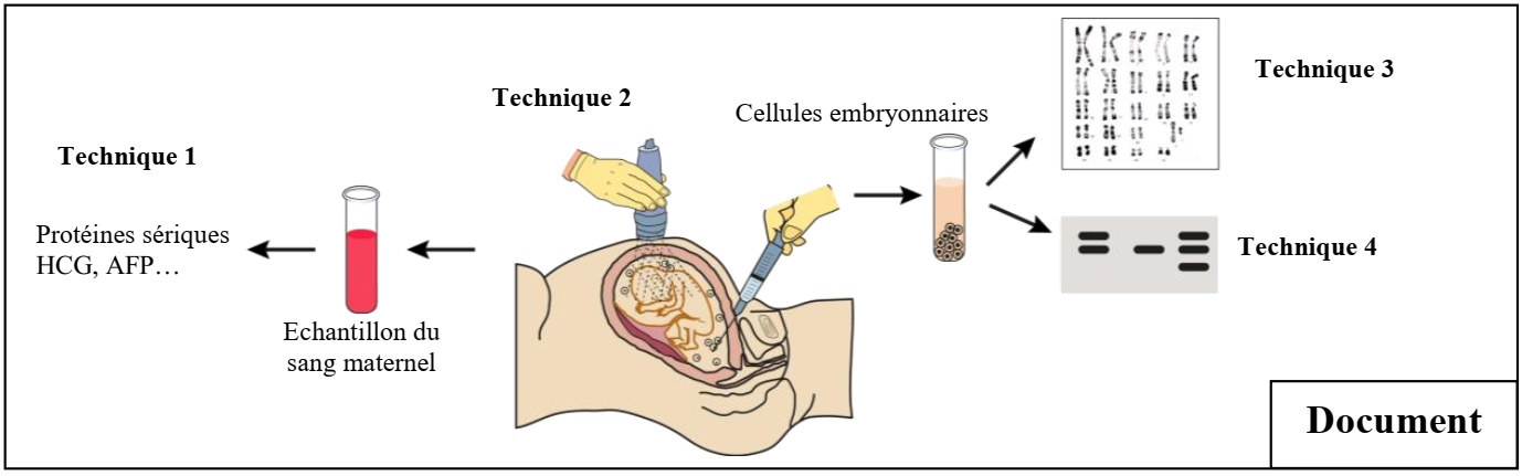 III. Le document suivant représente quatre techniques de diagnostic prénatal chez la femme. Recopiez sur votre feuille de production les numéros (1, 2, 3 et 4) et adressez à chaque numéro le nom de la technique qui lui correspond. (1 pt)