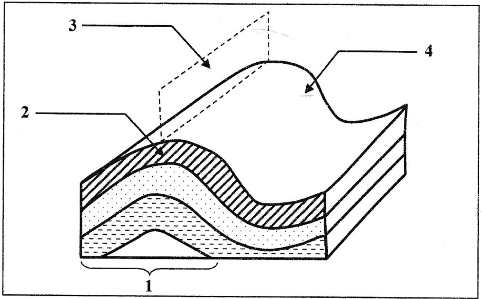 IV. Le document ci-contre représente un schéma d'une déformation tectonique accompagnant la formation des chaînes de montagnes. Recopiez sur votre feuille de rédaction les numéros des éléments indiqués par des flèches et attribuez à chaque élément le nom qui lui correspond. (1 pt)