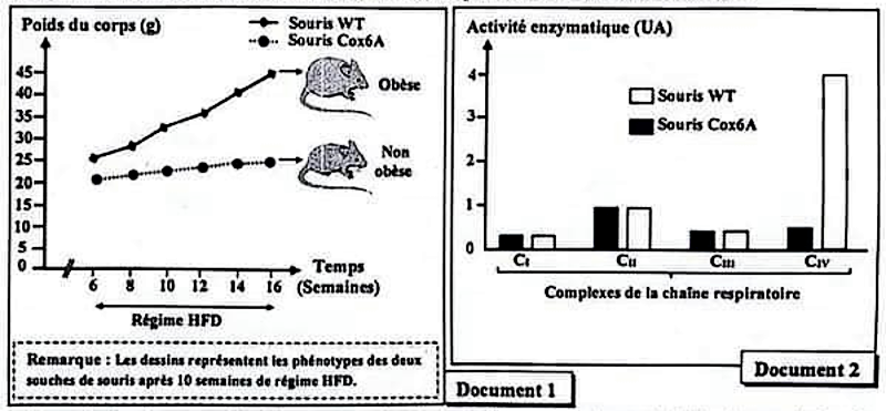 1. À partir des documents 1 et 2, comparer les résultats obtenus entre les souris WT et les souris Cox6A puis proposer une hypothèse expliquant la protection contre l'obésité chez les souris Cox6A. (1.5 pt)