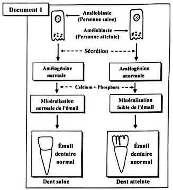 Donnée 1 : Le document (1) représente la relation entre l'amélogénine et l'état de l'émail dentaire chez une personne saine et chez une personne atteinte par l'amélogénèse imparfaite.
