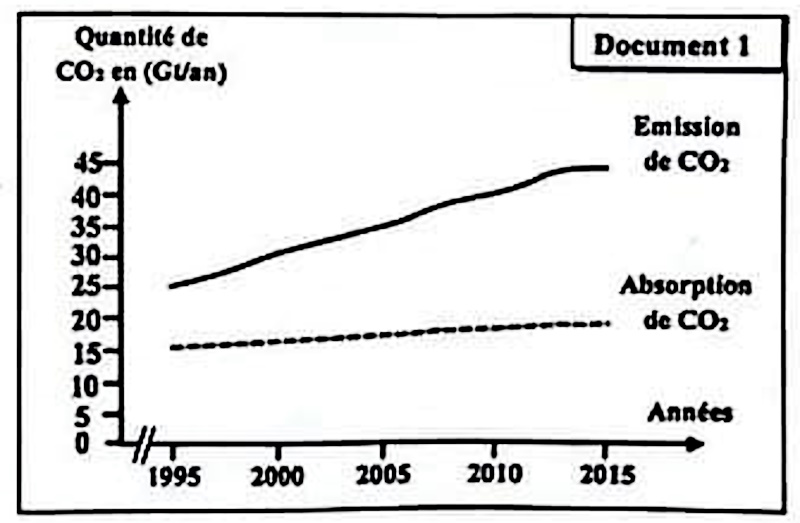 1. En exploitant les données du document 1, calculer la différence entre la quantité des émissions de CO2 et celle de CO2 absorbé en 1995 et en 2015, puis formuler un problème scientifique en relation avec cette différence. (0.75 pt)