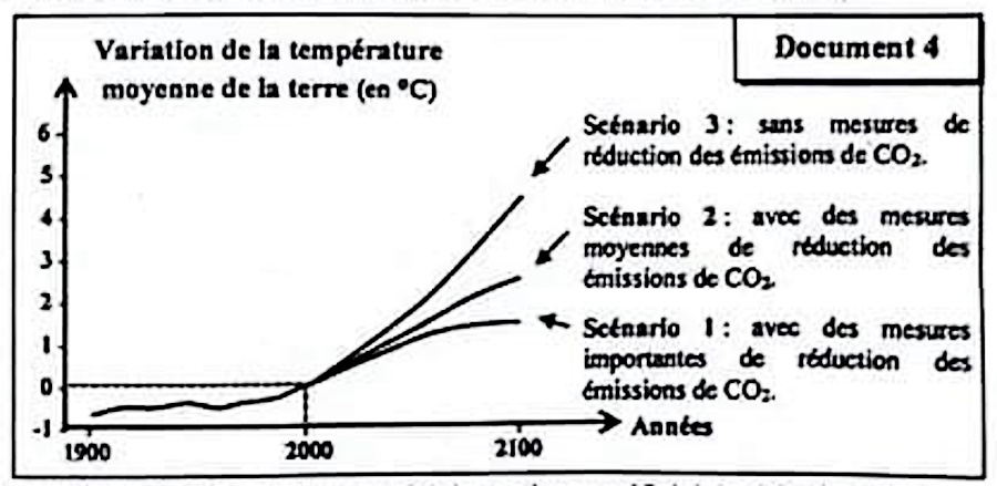 4. En utilisant le document 4, les données précédentes et vos connaissances, calculer la différence de la variation de la température selon chaque scénario entre 2000 et 2100 puis justifier le recours à la technique de captage et de stockage artificiel de CO2 pour éviter le scénario qui aura le plus grand impact sur le réchauffement climatique. (1.25 pt)