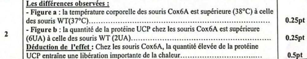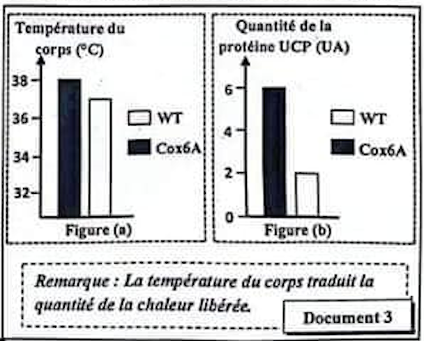 2. En exploitant le document 3, dégager les différences observées entre les deux souches de souris puis déduire l'effet de la quantité de l'UCP sur la quantité de la chaleur libérée par les souris Cox6A. (1 pt)