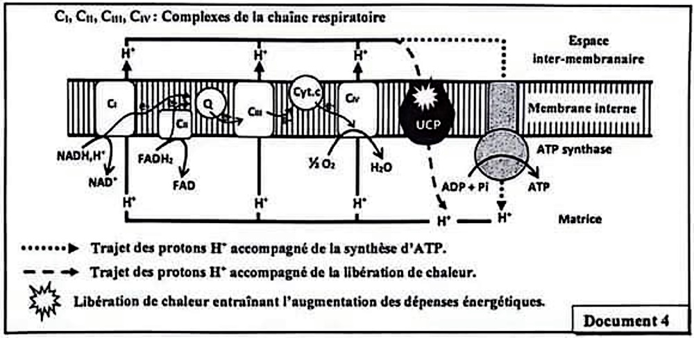 Donnée 3 : Des études ont montré que le changement de l'activité enzymatique du complexe Civ entraîne l'augmentation de l'activité de la protéine UCP responsable de la perte de poids (Protection contre l'obésité). Le document 4 représente le schéma du fonctionnement de la membrane mitochondriale interne et le rôle de la protéine UCP.