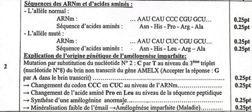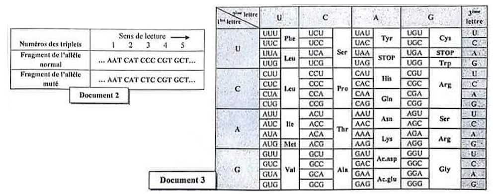 Donnée 2 : L'amélogénine est codée par un gène nommé «AMELX » qui existe sous deux formes alléliques : normale et mutée. Le document (2) présente un fragment du brin non transcrit pour chacun des deux allèles. Le document (3) présente le tableau du code génétique.