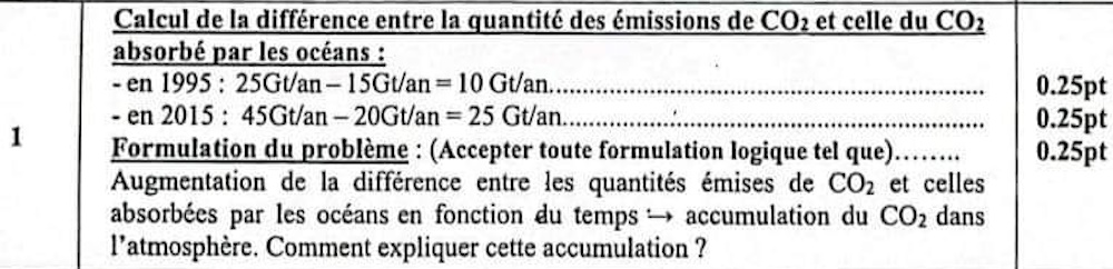 1. En exploitant les données du document 1, calculer la différence entre la quantité des émissions de CO2 et celle de CO2 absorbé en 1995 et en 2015, puis formuler un problème scientifique en relation avec cette différence. (0.75 pt)