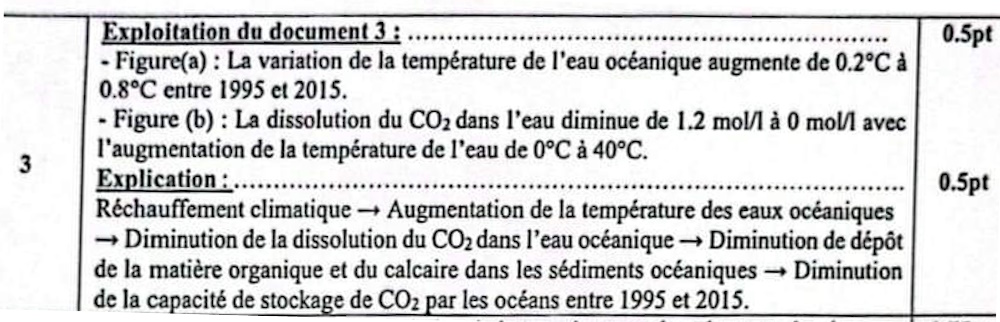 3. En exploitant le document 3 et les données précédentes, expliquer la variation de la différence entre la quantité des émissions de CO2 et celle de CO2 absorbée par les océans entre 1995 et 2015. (1 pt)