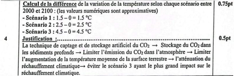 4. En utilisant le document 4, les données précédentes et vos connaissances, calculer la différence de la variation de la température selon chaque scénario entre 2000 et 2100 puis justifier le recours à la technique de captage et de stockage artificiel de CO2 pour éviter le scénario qui aura le plus grand impact sur le réchauffement climatique. (1.25 pt)