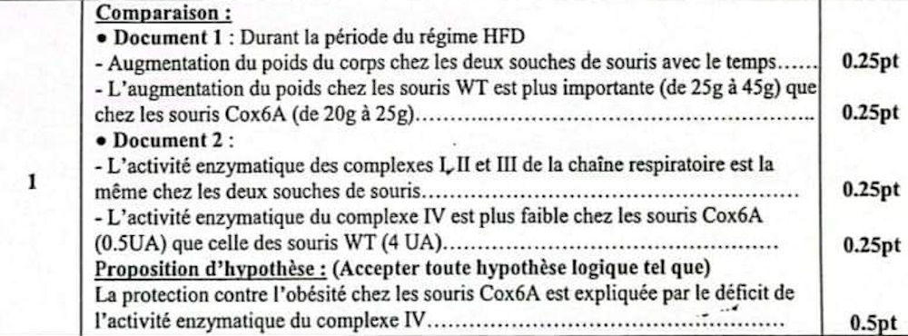 1. À partir des documents 1 et 2, comparer les résultats obtenus entre les souris WT et les souris Cox6A puis proposer une hypothèse expliquant la protection contre l'obésité chez les souris Cox6A. (1.5 pt)