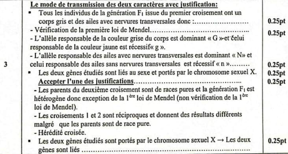 3. En vous basant sur les résultats des deux croisements, déterminer, en justifiant votre réponse, le mode de transmission des deux caractères héréditaires étudiés. (1.5 pt)