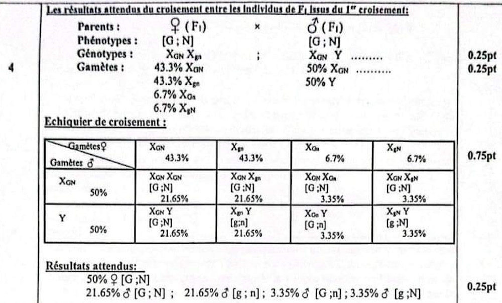4. Sachant que la distance entre les deux gènes étudiés est : 13,4 cM, donner les résultats attendus du croisement entre les individus de F1 issus du premier croisement en vous aidant d'un échiquier de croisement. (1.5 pt)