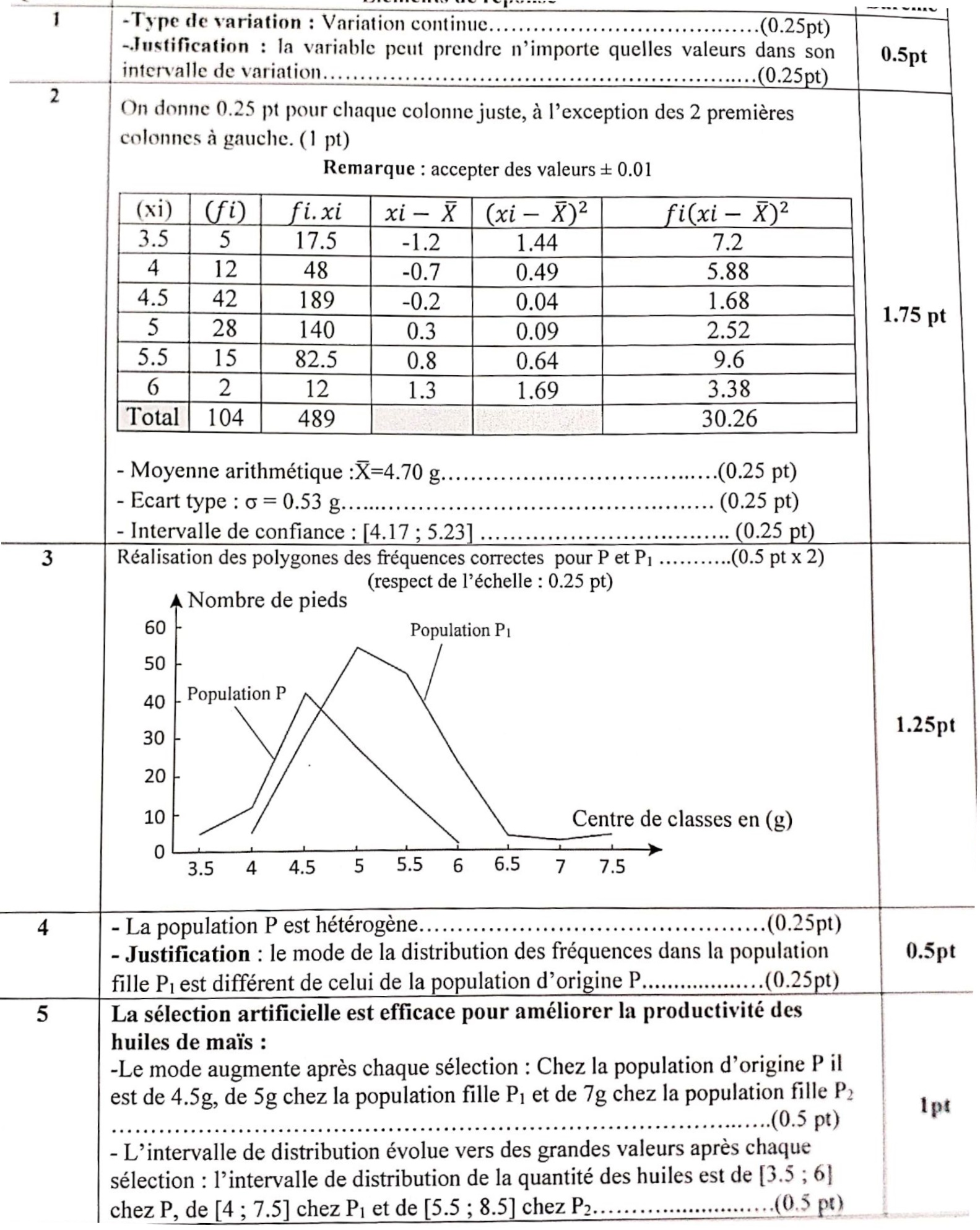 Des chercheurs ont récolté des épis (voir document 1) à partir de 104 pieds d'un champ de maïs, qui représentent la population statistique P, puis ils ont mesuré la quantité d'huiles en (g) extraite de 100 g de grains pour chaque pied de cette population. Le document (2) présente les résultats statistiques de la distribution de la quantité d'huiles chez la population P.