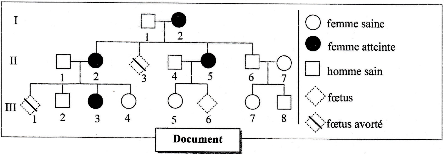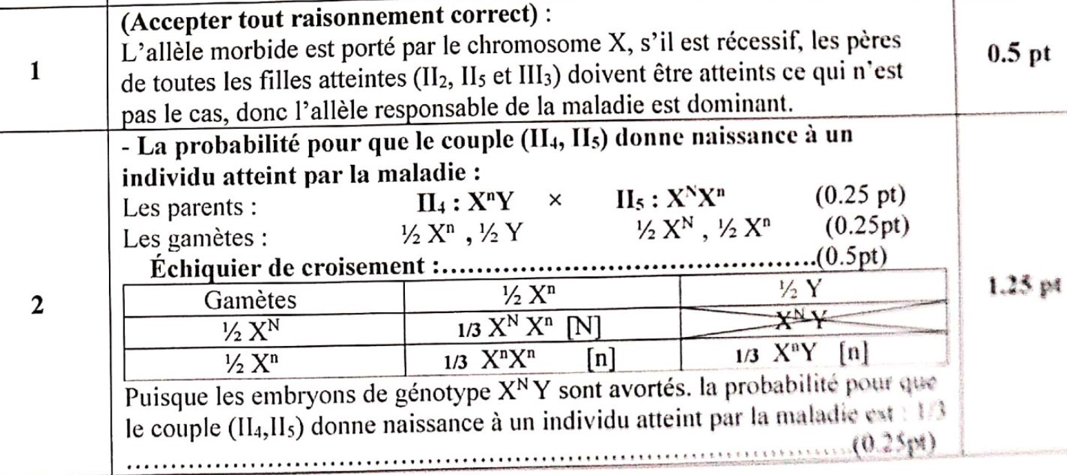2. Sachant que le fœtus qui ne porte que l'allèle morbide est avorté, déterminez, en vous aidant d'un échiquier de croisement, la probabilité pour que le couple (II4, II5) donne naissance à un individu atteint par cette maladie. (1.25 pt)