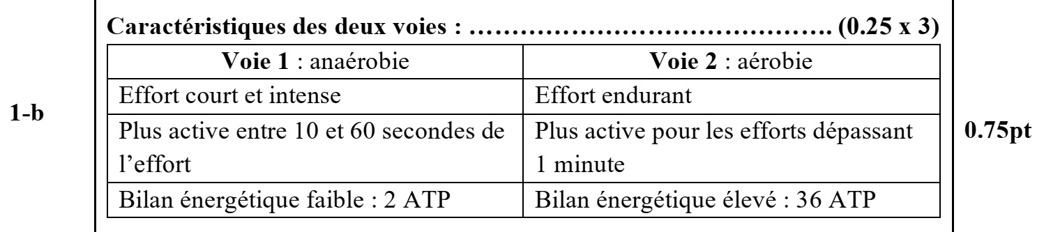 b. Dégagez sous forme d’un tableau, les caractéristiques de la voie 1 (anaérobie) et de la voie 2 (aérobie) lors de l’effort physique. (0.75pt)