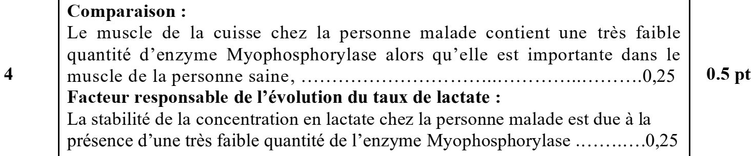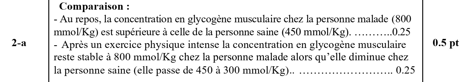 a. Comparez les concentrations en glycogène musculaire de la personne malade à celles de la personne saine, au repos et après l’exercice physique. (0,5 pt)
