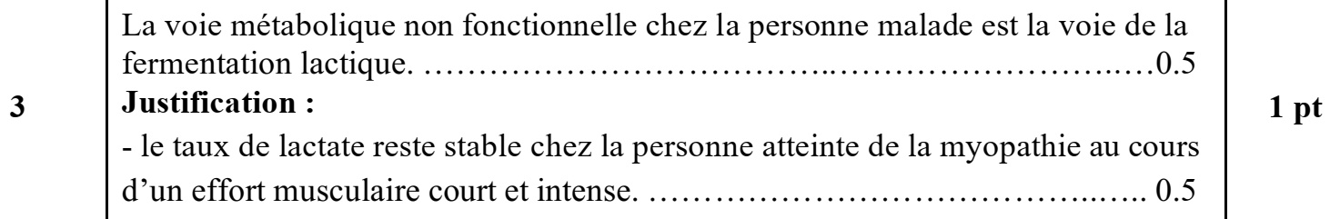 3. En vous basant sur les deux documents 1 et 2, déduisez la voie métabolique non fonctionnelle chez la personne atteinte de la myopathie étudiée lors d’un exercice physique intense et de courte durée. Justifiez votre réponse. (1pt)