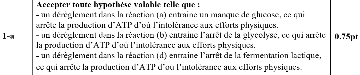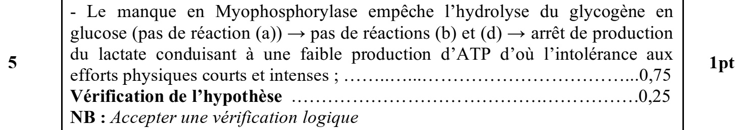 5. En vous basant sur les données précédentes (1, 2 et 3), expliquez l’origine de l’intolérance aux efforts physiques courts et intenses chez les personnes atteintes de la myopathie étudiée et vérifiez l’hypothèse proposée en réponse à la question 1(a). (1 pt)