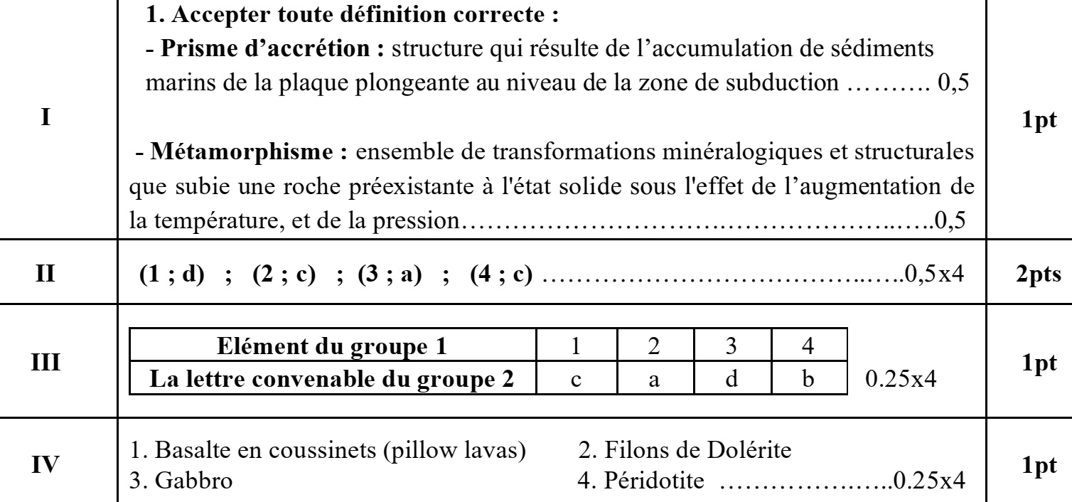 I. Définissez les notions suivantes : Prisme d’accrétion - Métamorphisme. (1pt)
